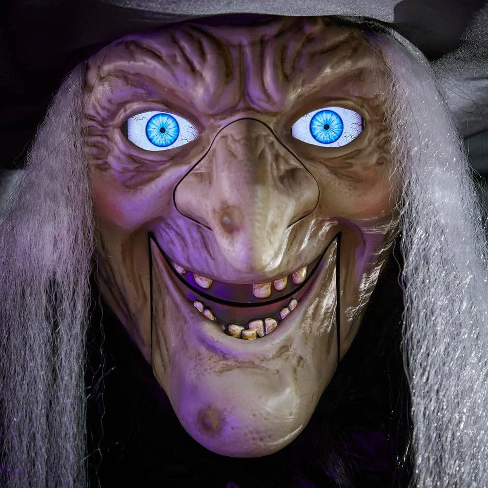 Designed for outdoor use, this foot flying witch animatronic is the perfect centerpiece for any Halloween party.