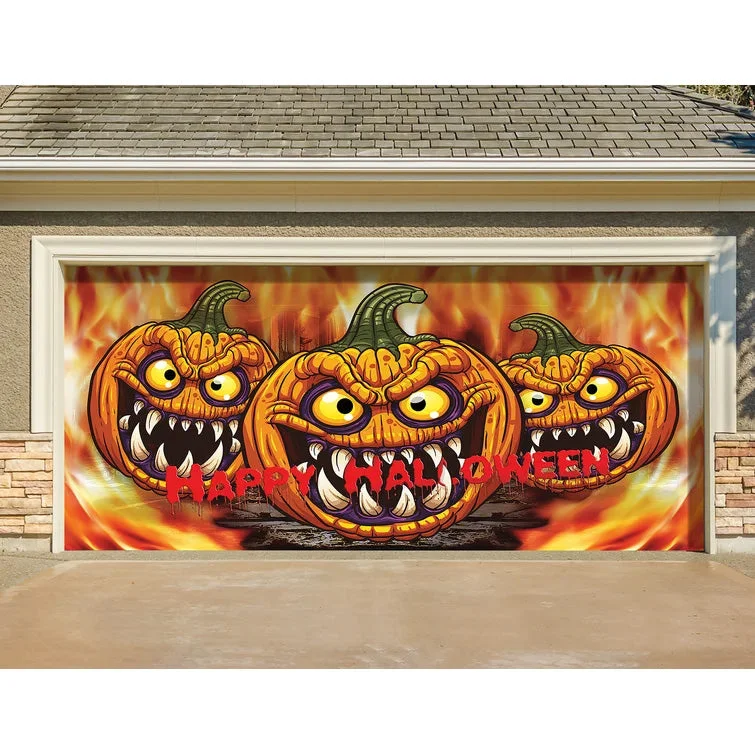 7' x 16' Scray Jack O Lantern Three Scary Pumpkins Garage Door Mural