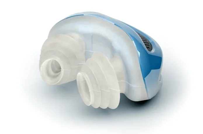 It's design is a combination of several inventions, chief of which are the micro-blowers originally intended for heat regulation for chips in computers. These micro-blowers are entirely contained within the Airing device, so there is no need for external air hoses. Each it device is Just “plug” the comfortable buds into your nostrils and breathe all night long.