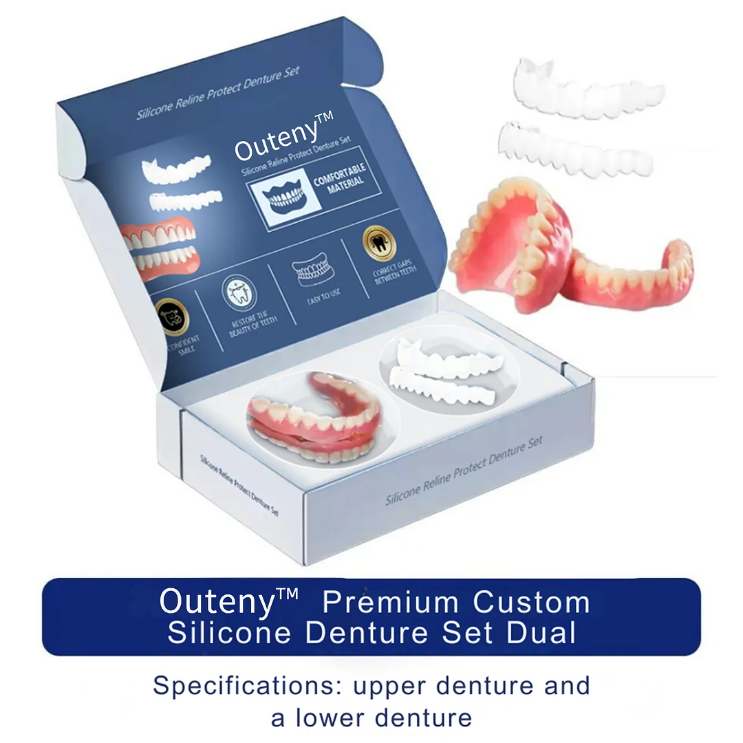 The Outeny™ Premium Custom Silicone Denture Set Dual provides an exceptional alternative to traditional dental implants, offering convenience and affordability. Priced at just $39.99, this innovative solution allows you to restore your smile and improve chewing function without enduring the high costs and long treatment times associated with dental implants, which can run into tens of thousands of dollars. Choose Outeny™ for a cost-effective, easy-to-use option that helps ou achieve a confident, beautiful smile—quickly and affordably.