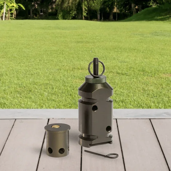 Made of Aluminum, this unit utilizes a spring-loaded mechanism and an activate-by-wire system. When the activation mechanism is disturbed (by an animal or something else causing activity), the unit will activate. This device is compatible with flares and other signaling items, depending on situation and requirement.