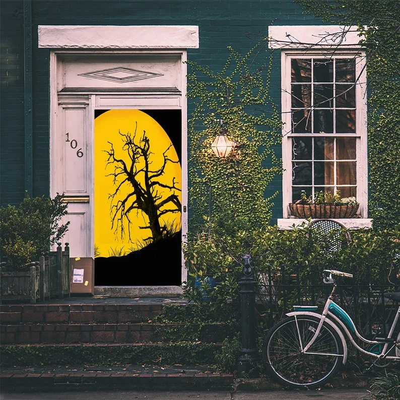 Our Halloween house decorations like this Yellow Full Moon fabric door wrap are sure to impress your neighbors and trick or treaters.