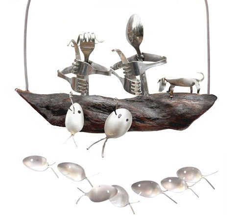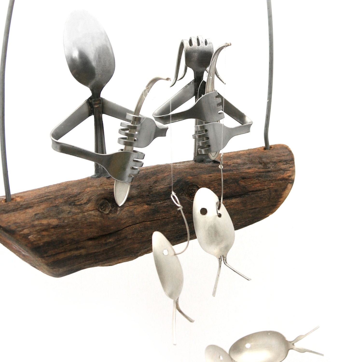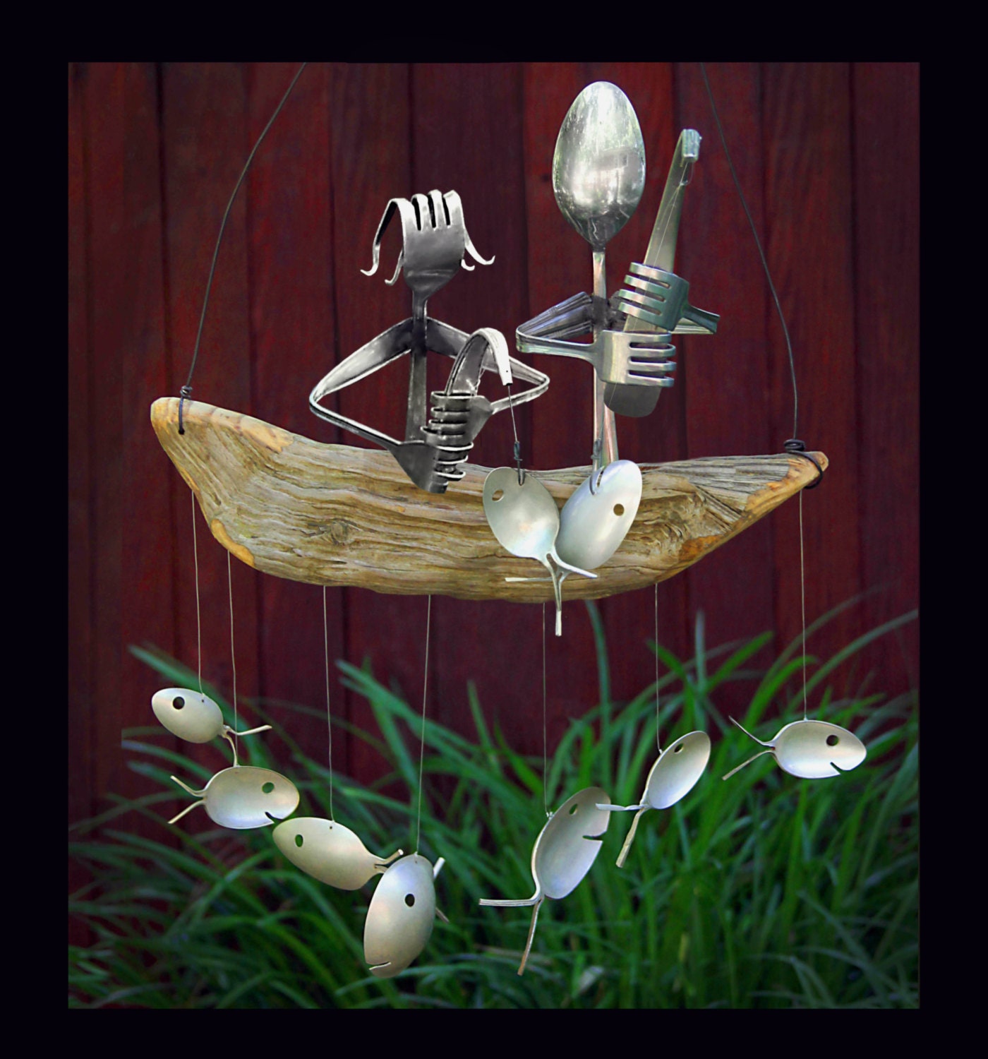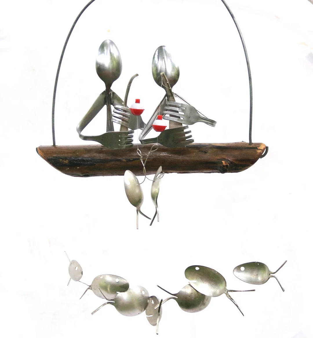 This Darling Duo proudly shows off their catch while sitting atop a natural driftwood boat. Perfect for any porch or yard. Driftwood dingy gently will rock in the breeze producing a delightful mellow sound. Each finished product is approx. 12" x 18". This Husband & Wife Fishing Trip Windchime is the perfect engagement, wedding, or anniversary gift fish the fishing enthusiast couple in your life. A wonderful addition for any home, beach house, or lakeside getaway. Driftwood dingy gently will rock in the breeze producing a delightful mellow sound. Spoon Fish and Fishing Poles are upcycled from vintage and antique Silver Plated Flatware. The handcrafted fishermen and women are carefully welded from durable stainless steel. Each chime will have a total of 9 varied spoon fish, 1 Man and 1 Woman fishers complete with a fishing rod & their catch. Sit back, relax and listen to the chimes whispering gentle stories of centuries past! Driftwood comes finished to ensure your windchime will last for years to come. Suitable for indoor & outdoor use. The handmade nature of our products results in slight variations which give each piece a unique character.
