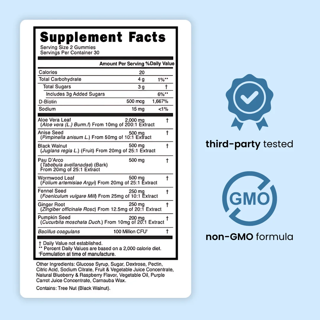 Our Para cleanse gummies are a scientifically-proven, all-natural way to quickly cleanse yourself without disturbing procedures or lab-made pills.
