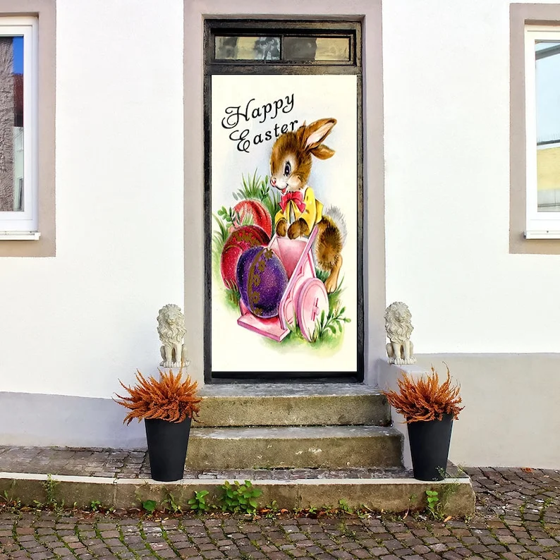 Happy Easter. Simple purple graphics with cute little bunny highlights the lighter side of Easter. You'll have the best time too, and the best door this Easter holiday with one of our unique fabric door covers. This fabric door wrap will look amazing hanging outside or inside this holiday season. Our fabric door covers take less than a minute to install.