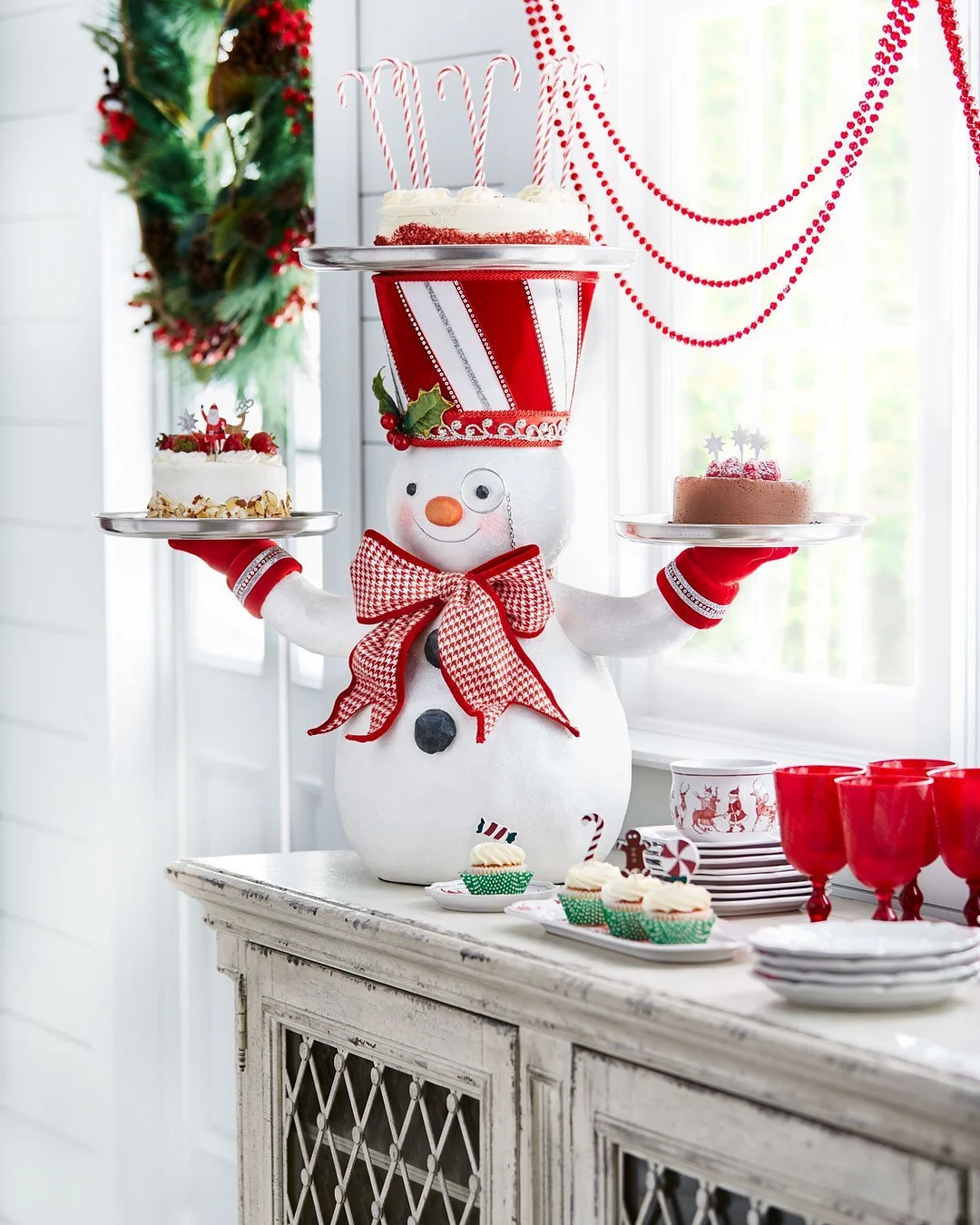 This little cutie is here to lend a helping hand this year! The little white snowman has a smiling face, blushing cheeks, a large orange nose, and a monocle over his eye! Two clumps of coal and a red and white houndstooth bow around his neck with his arms out to the side holding two trays! The red and white striped top hat on his head doubles as a third tray! Perfect to hold cookies and treats!