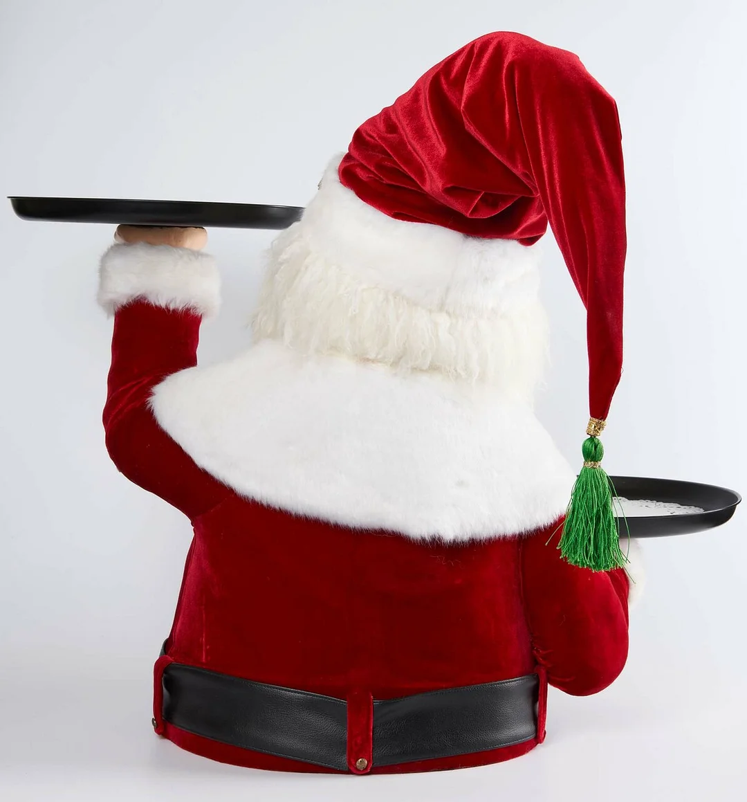He has a fluffy white beard and a smiling face with brown eyes peering out from metal rimmed glasses! His hat is long accented with a green tassel and a holly leaf! In each hand he holds up a tray perfect to place cupcakes, treats, or even champagne glasses!